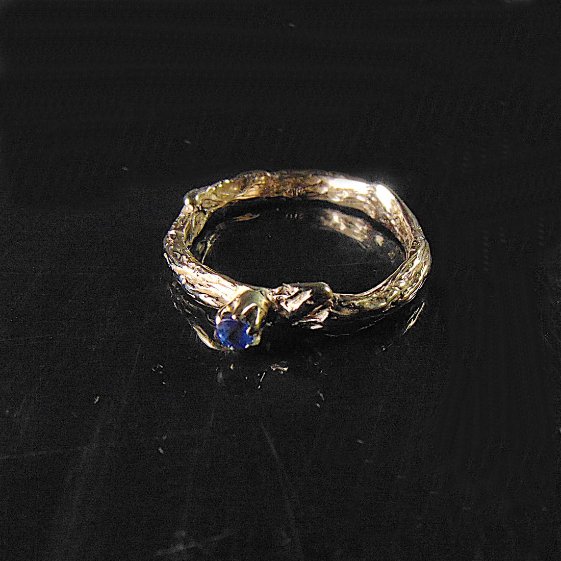 Złoty pierścionek z szafirem inspirowany naturą, ręcznie wykonany w złocie 585.