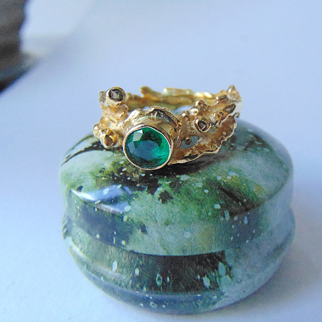 Pierścionek pozłacany z syntetycznym szmaragdem Gałązki