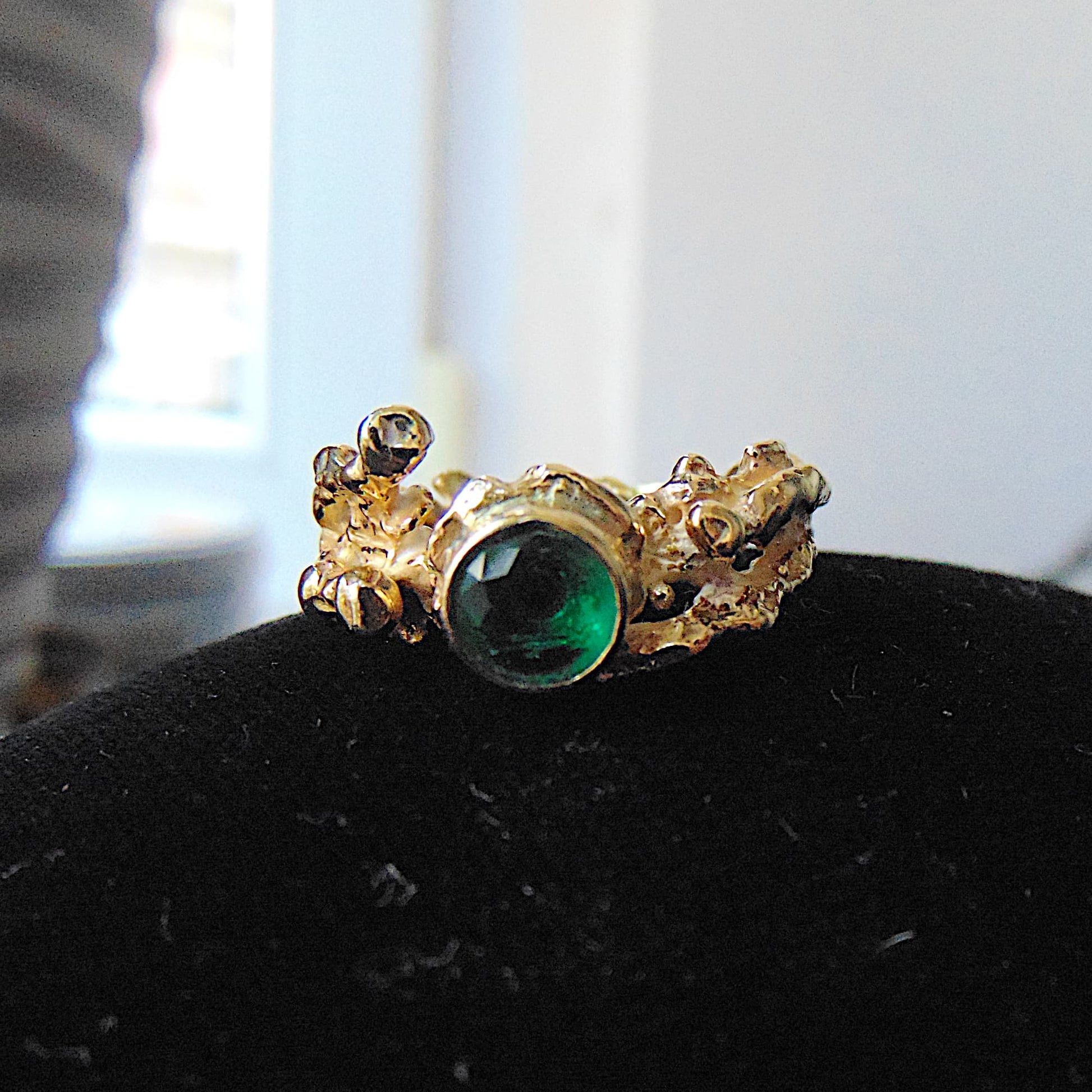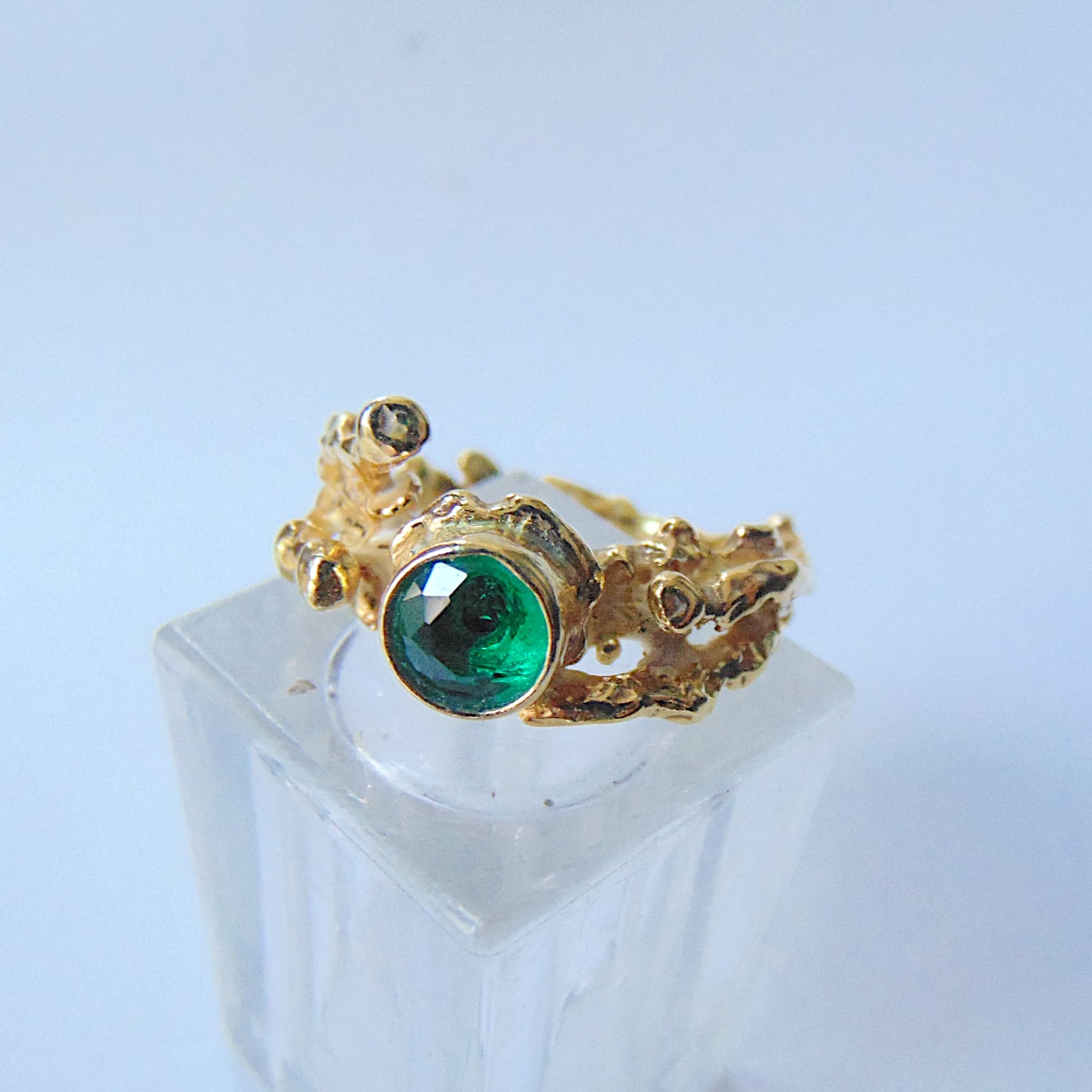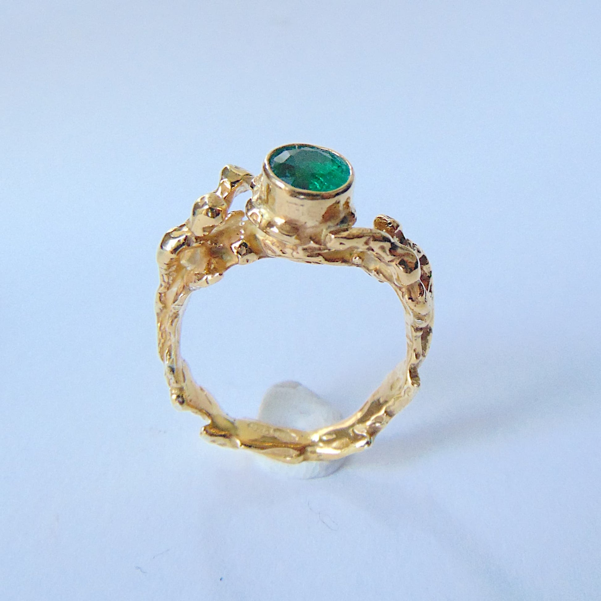 Pierścionek z kolekcji "Gałązki", inspirowany organicznymi formami lasu. Jego centralnym punktem jest syntetyczny szmaragd o średnicy 6 mm, wyróżniający się intensywną, soczyście zieloną barwą. Kamień został otoczony finezyjnie uformowanymi gałęziami, które płynnie przechodzą w obrączkę.