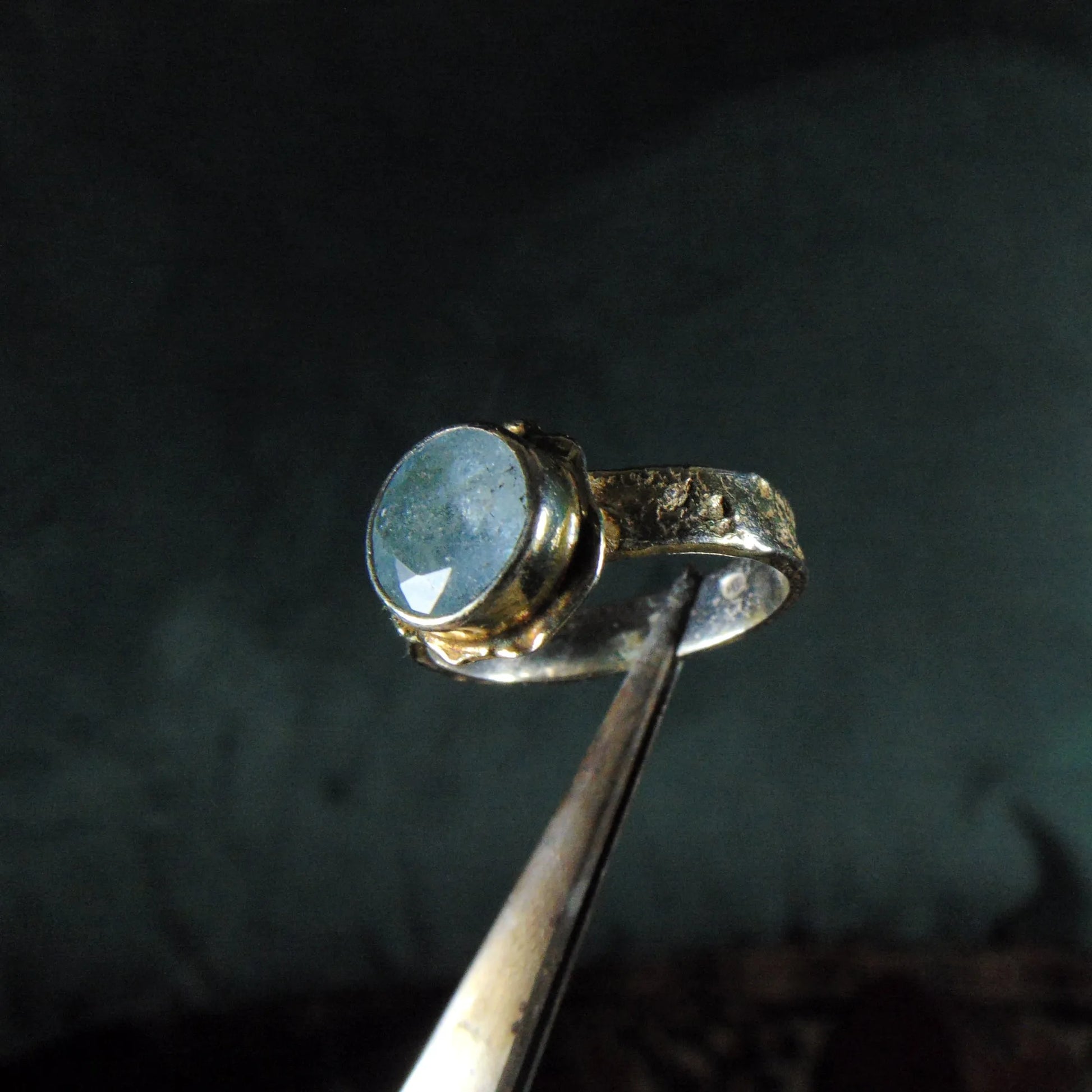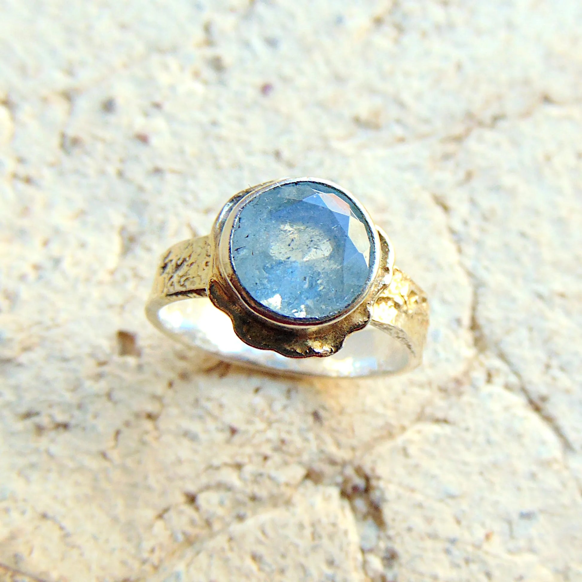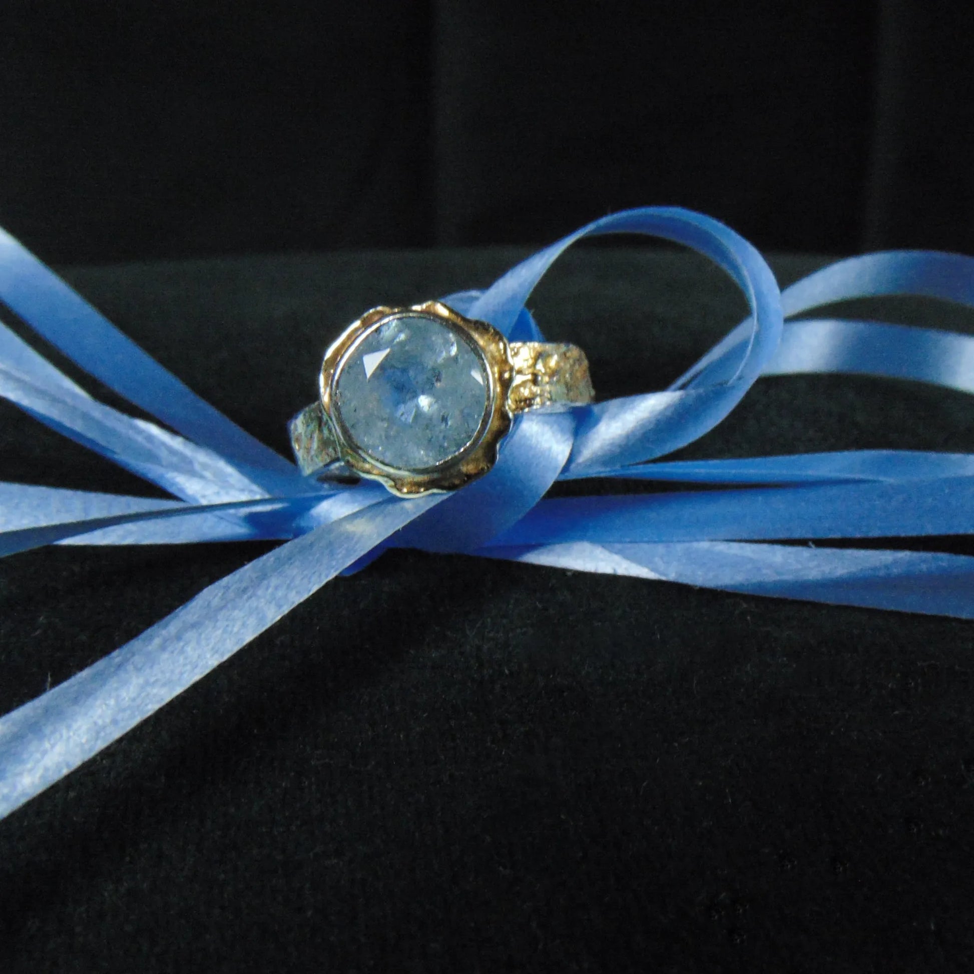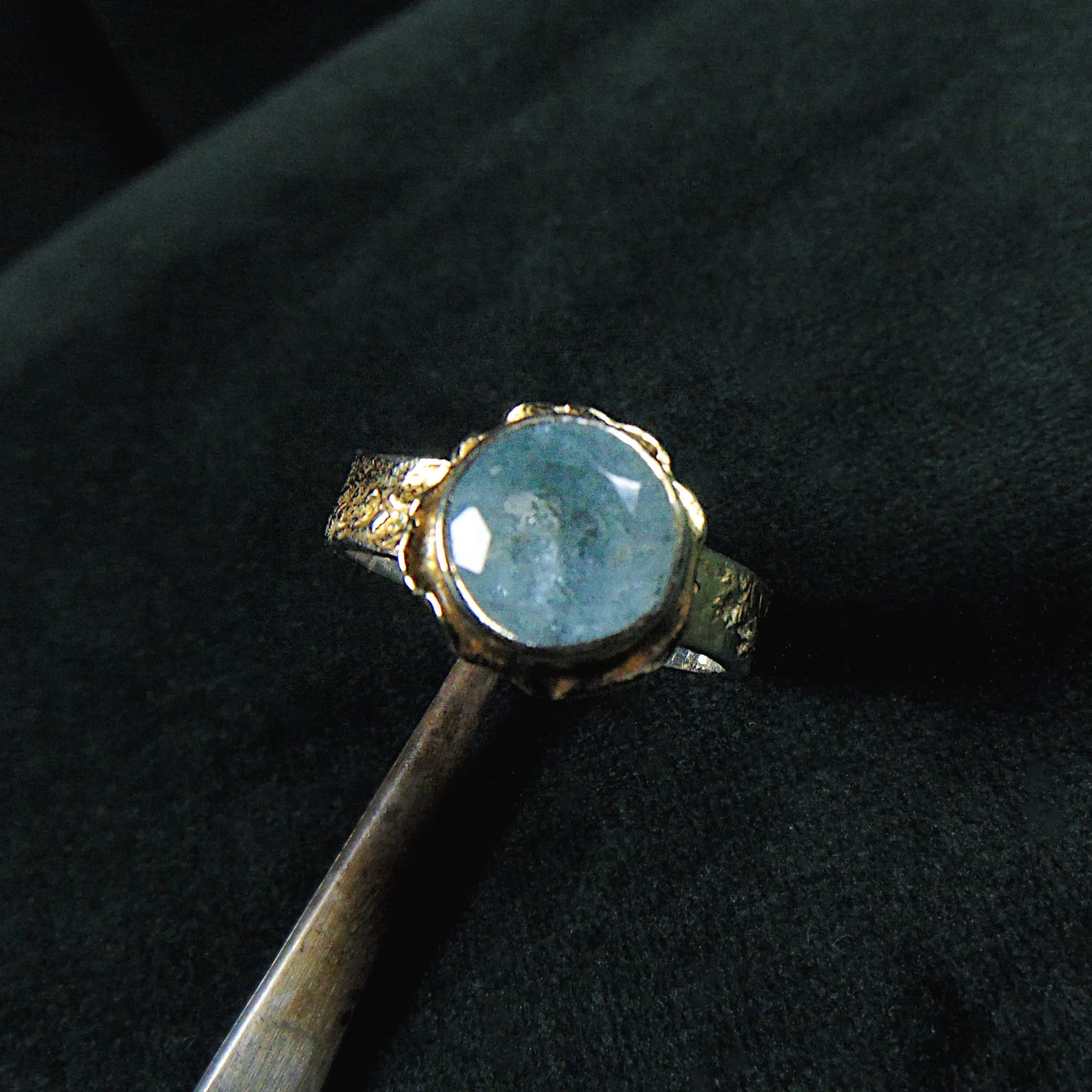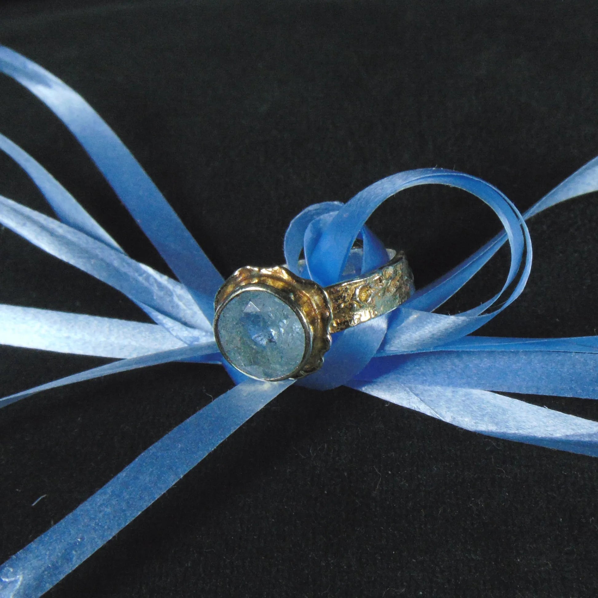 Pierścionek srebrny pozłacany z pięknym okazem akwamarynu z Brazylii. Wykonany ze srebra pr. 925, a następnie pozłocony 24-karatowym złotem. Akwamaryn ma okrągły kształt i liczne inkluzje, które nadają mu bardzo ciekawy wygląd, ma on kolor wody morskiej. Akwamaryn jet to szlachetny kamień o bardzo dobrej energii, to kamień żeglarzy i wędrowców, zawsze prowadzi do domu. Pierścionek ma rozmiar:a19-20, waga: 4, 8 g, średnica akwamarynu: 10 mm