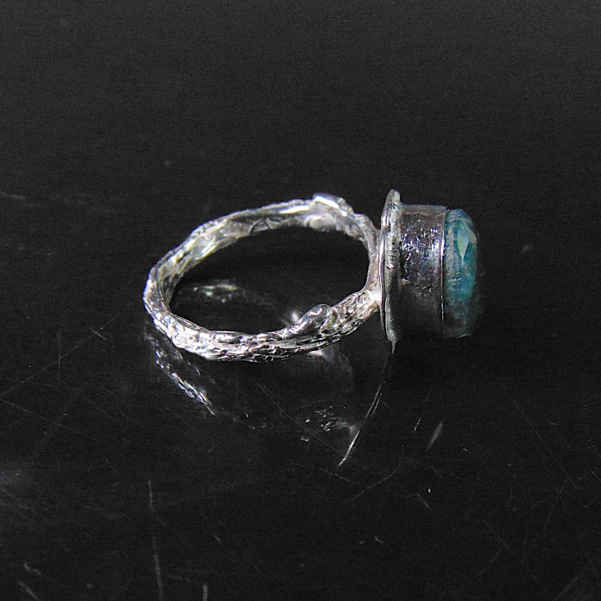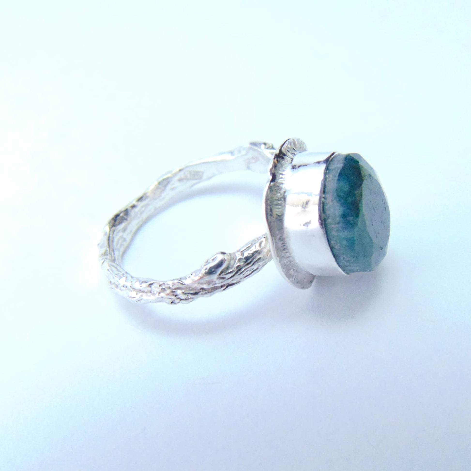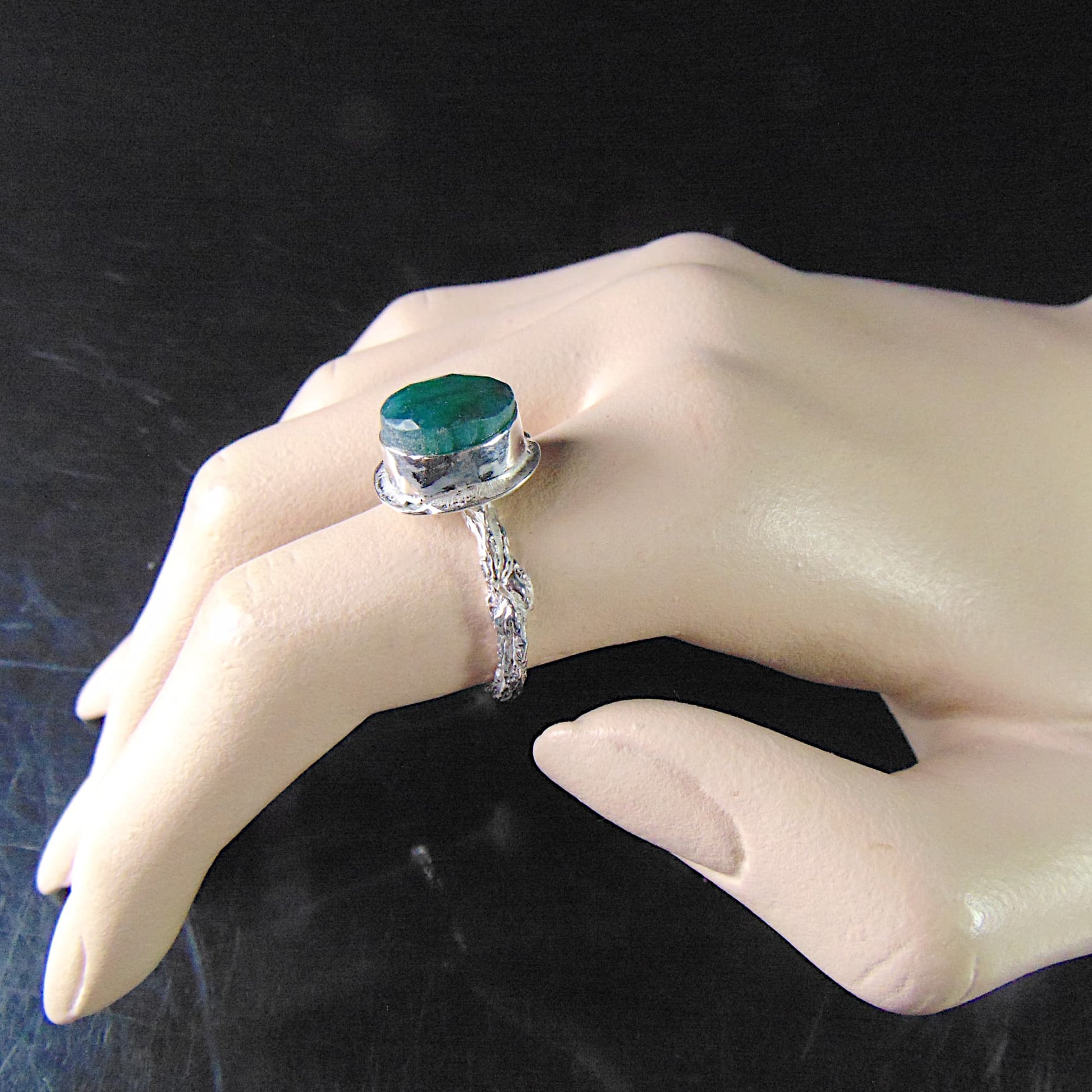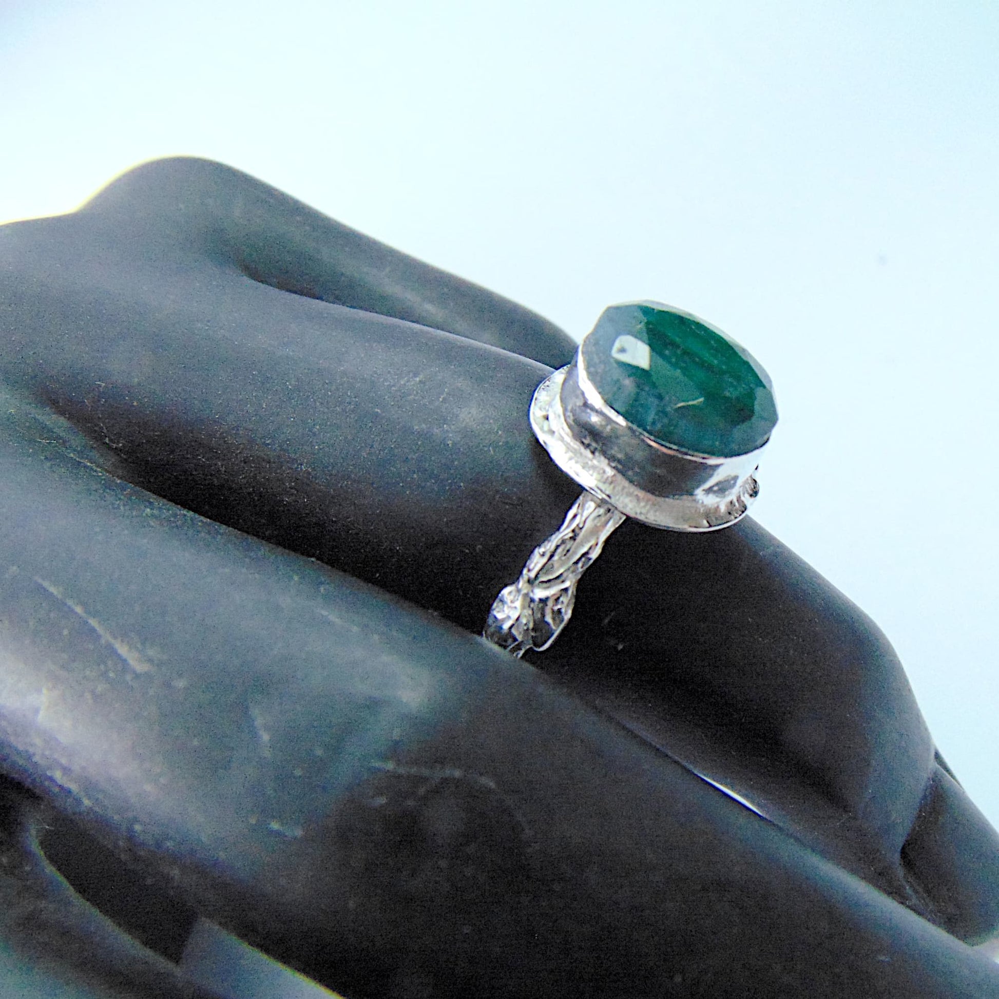W tym projekcie wyrazistość kamienia została zrównoważona subtelnością oprawy. Obrączka jest wąska i półokrągła, a jej całą powierzchnię precyzyjnie rzeźbiono, nadając jej fakturę kory drzewa. Pierścionek wykonano ze srebra próby 925, łącząc artystyczną inspirację naturą z komfortem noszenia.