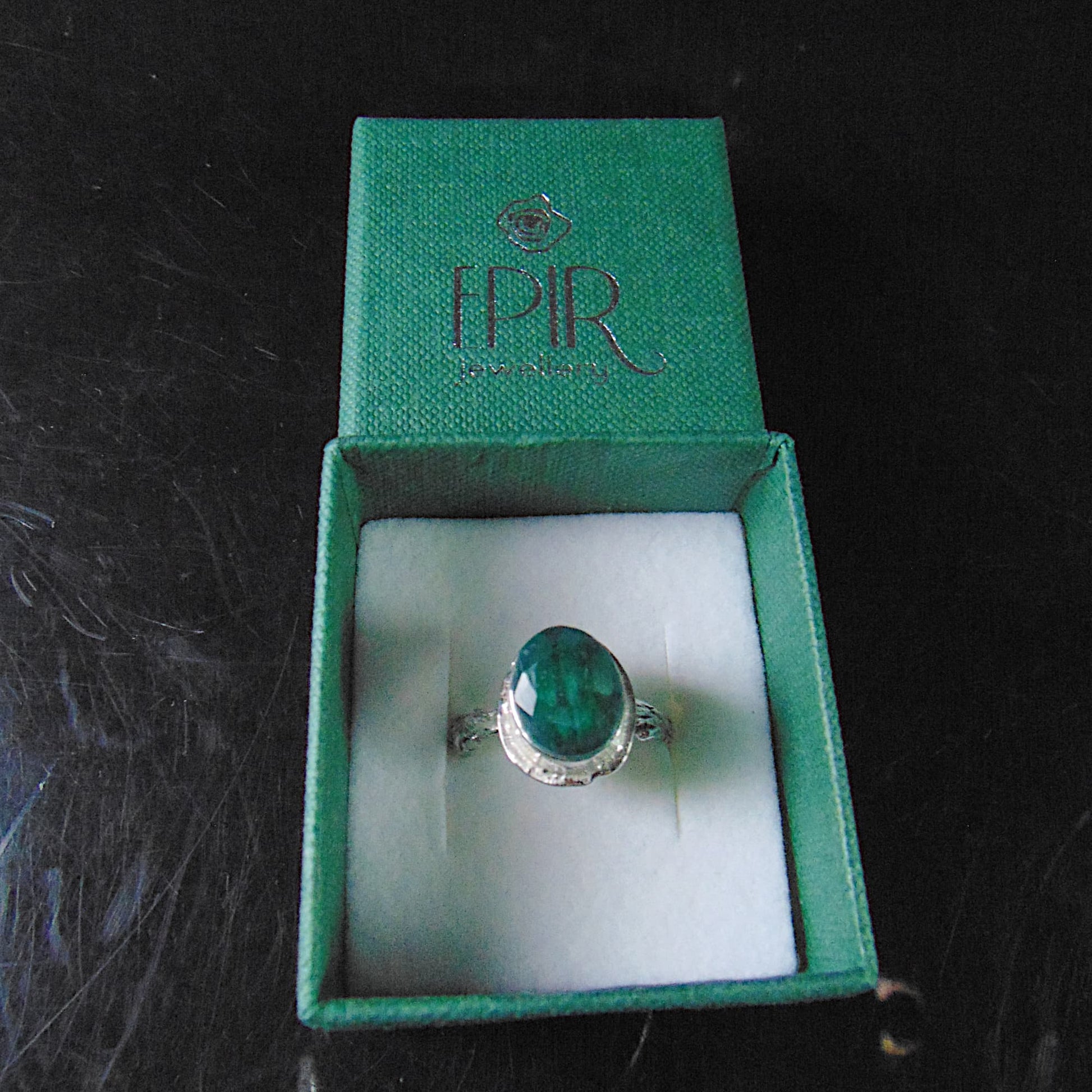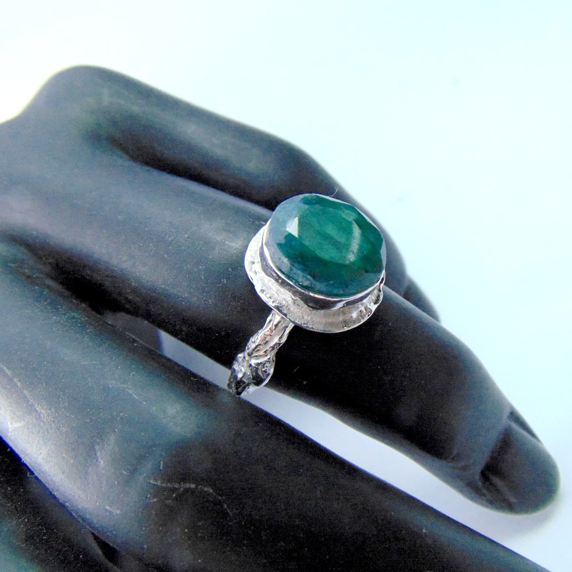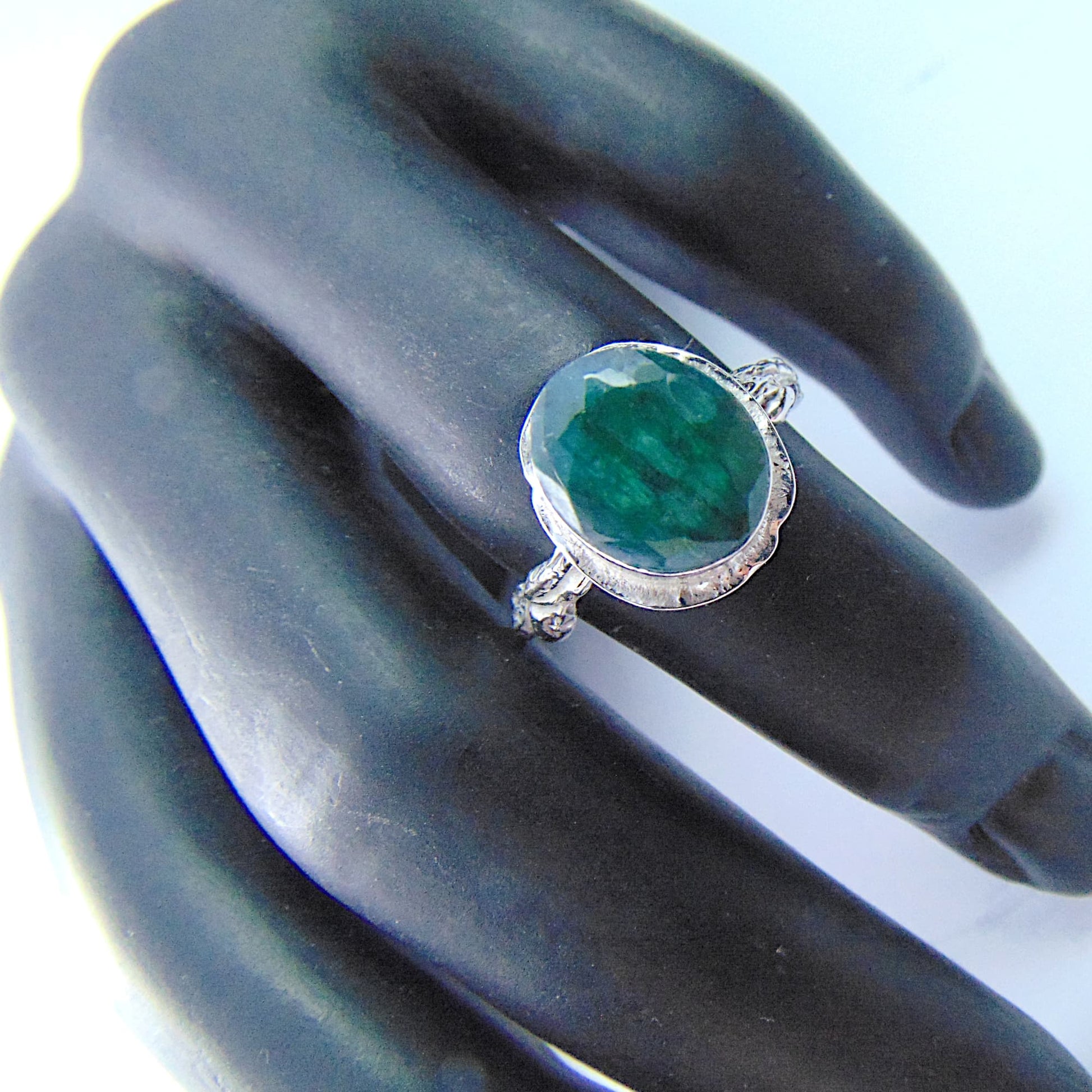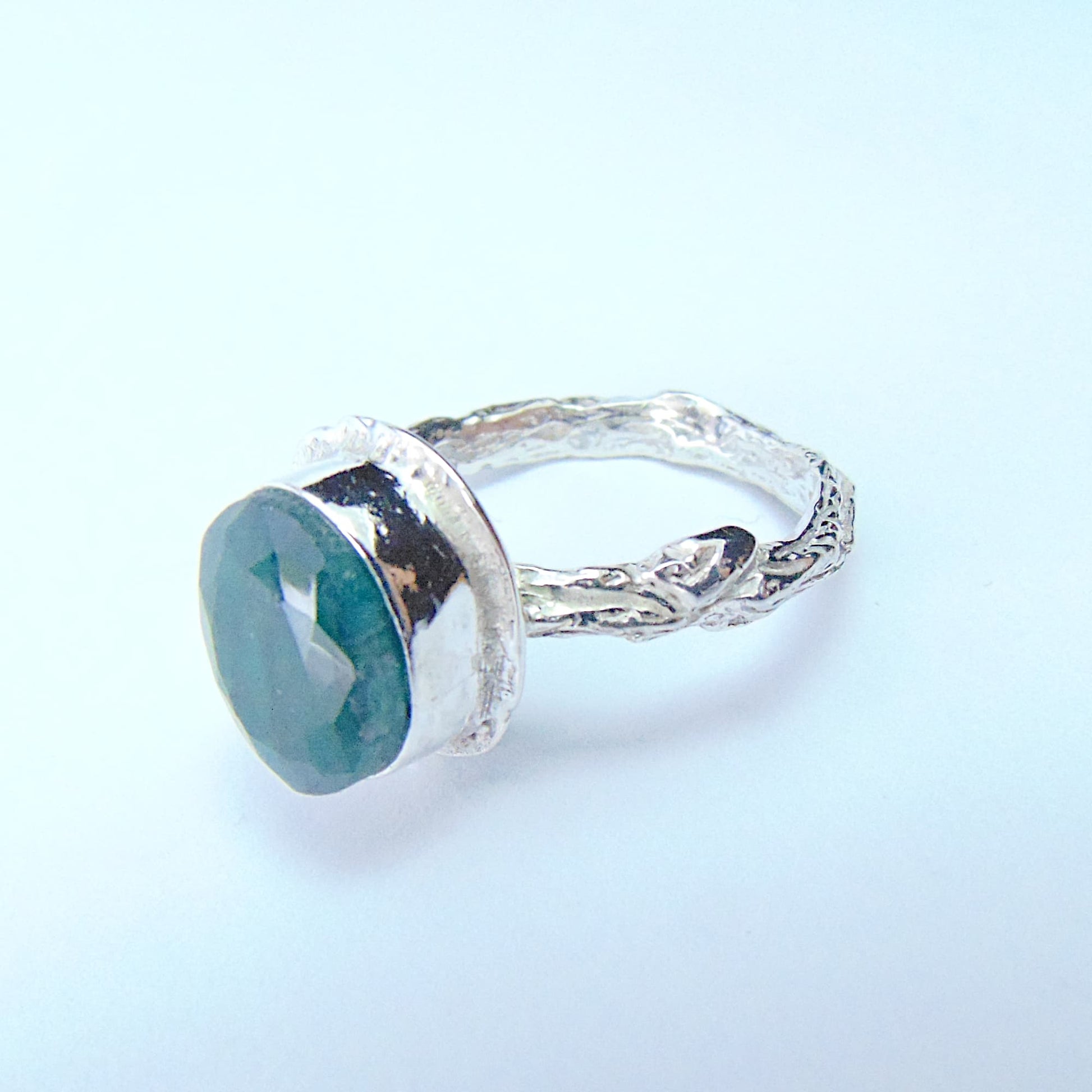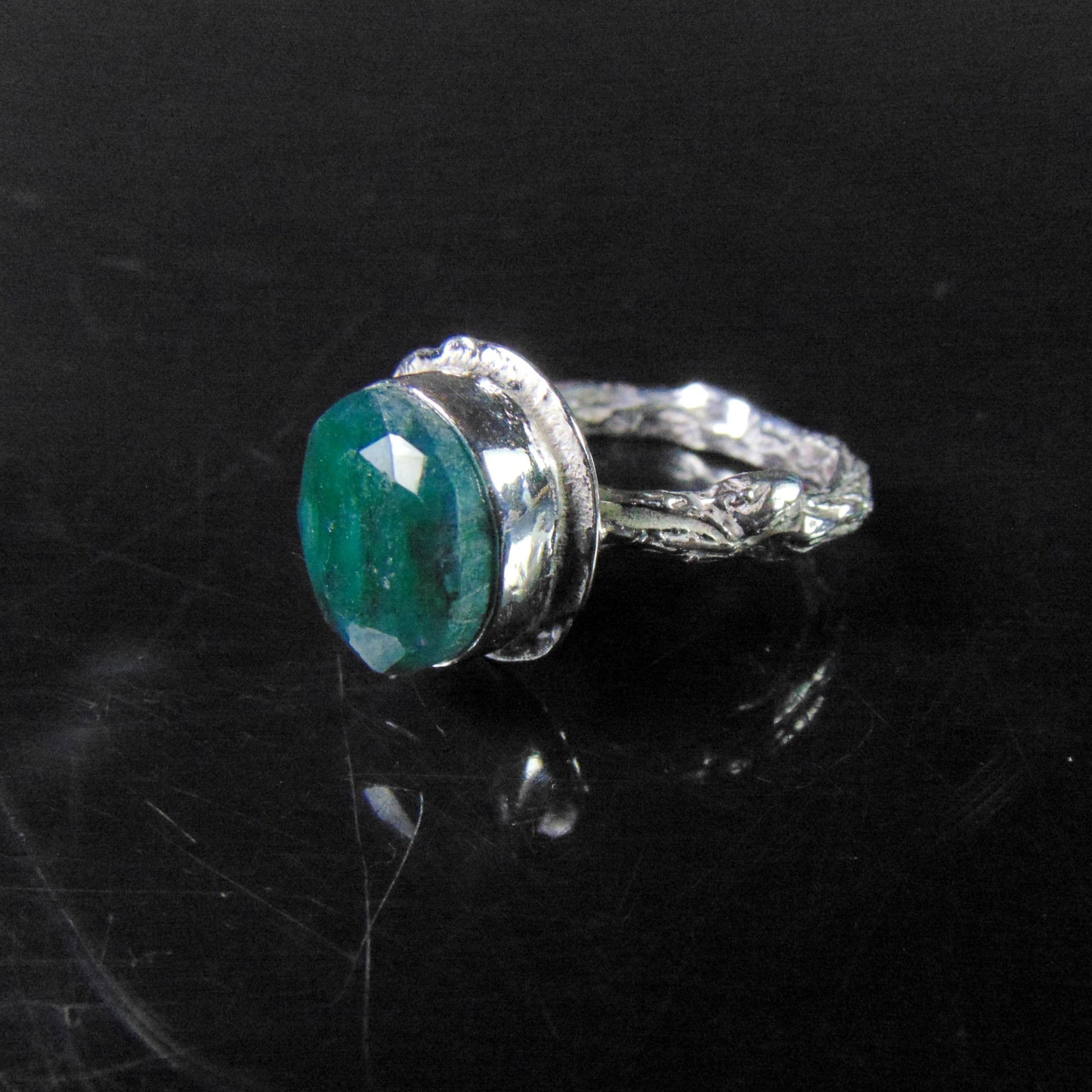 W tym projekcie wyrazistość kamienia została zrównoważona subtelnością oprawy. Obrączka jest wąska i półokrągła, a jej całą powierzchnię precyzyjnie rzeźbiono, nadając jej fakturę kory drzewa. Pierścionek wykonano ze srebra próby 925, łącząc artystyczną inspirację naturą z komfortem noszenia.