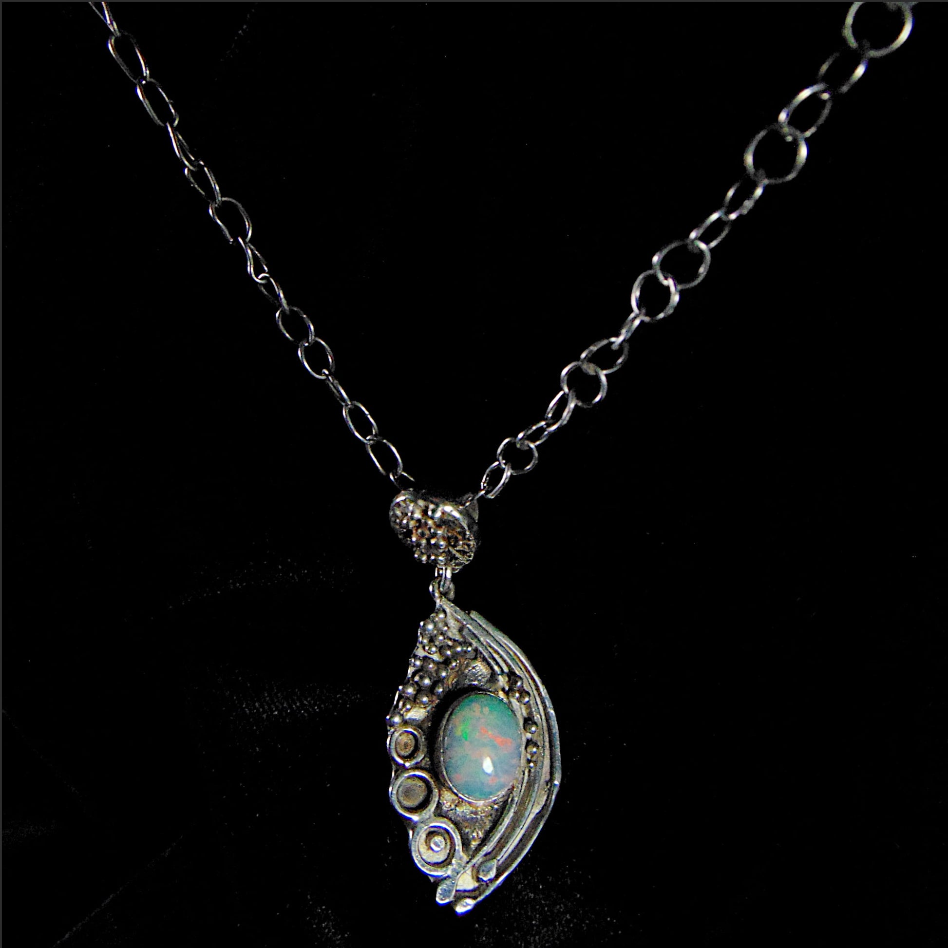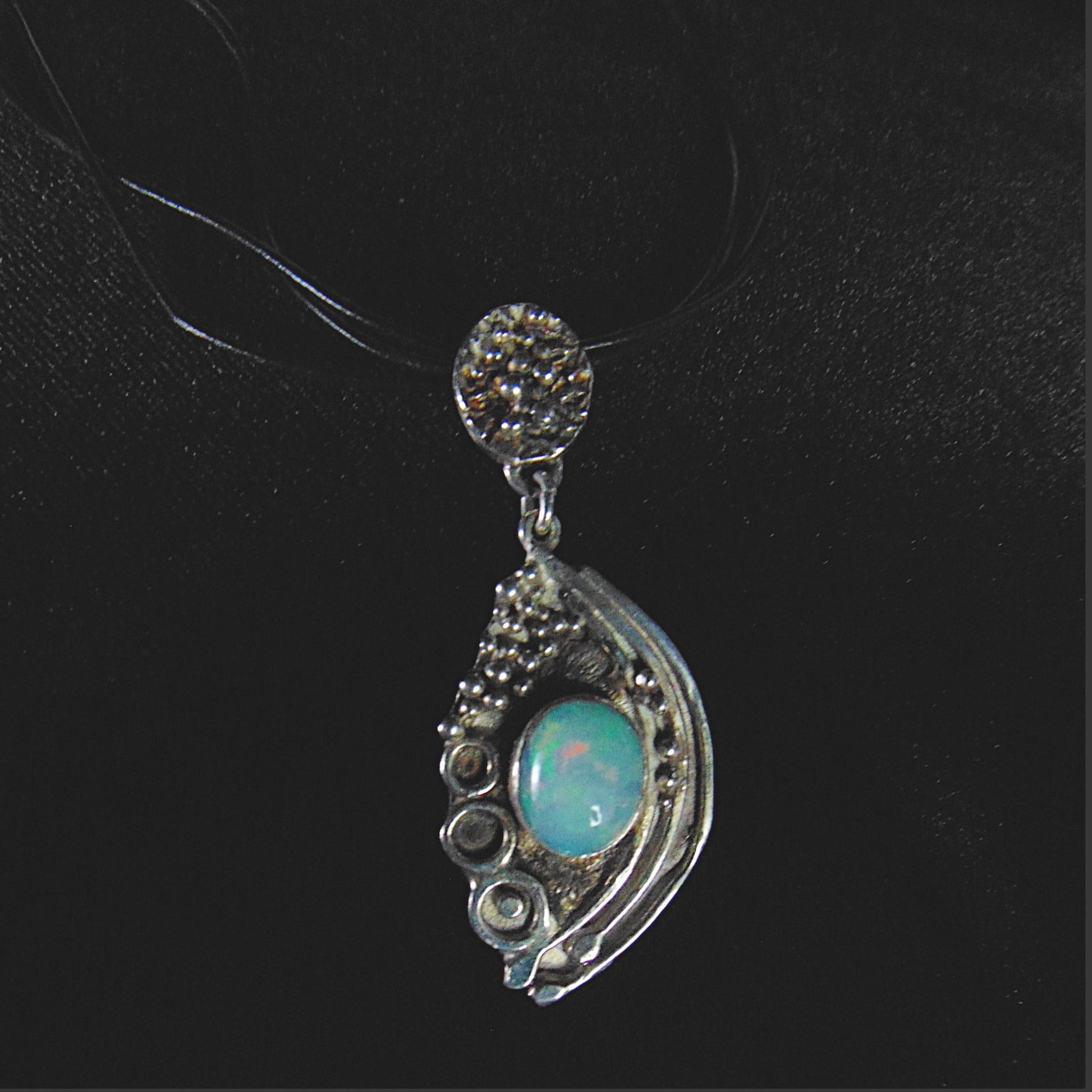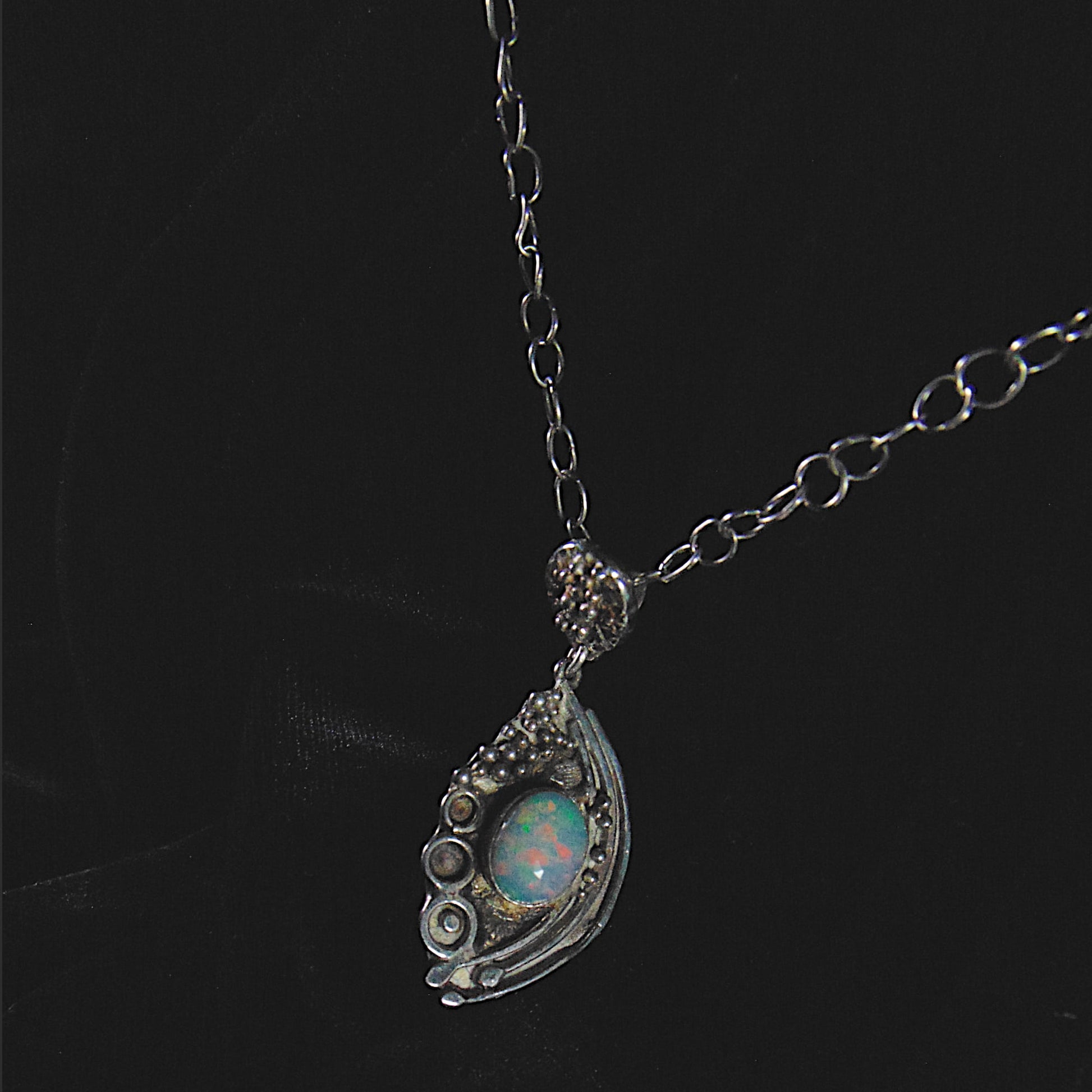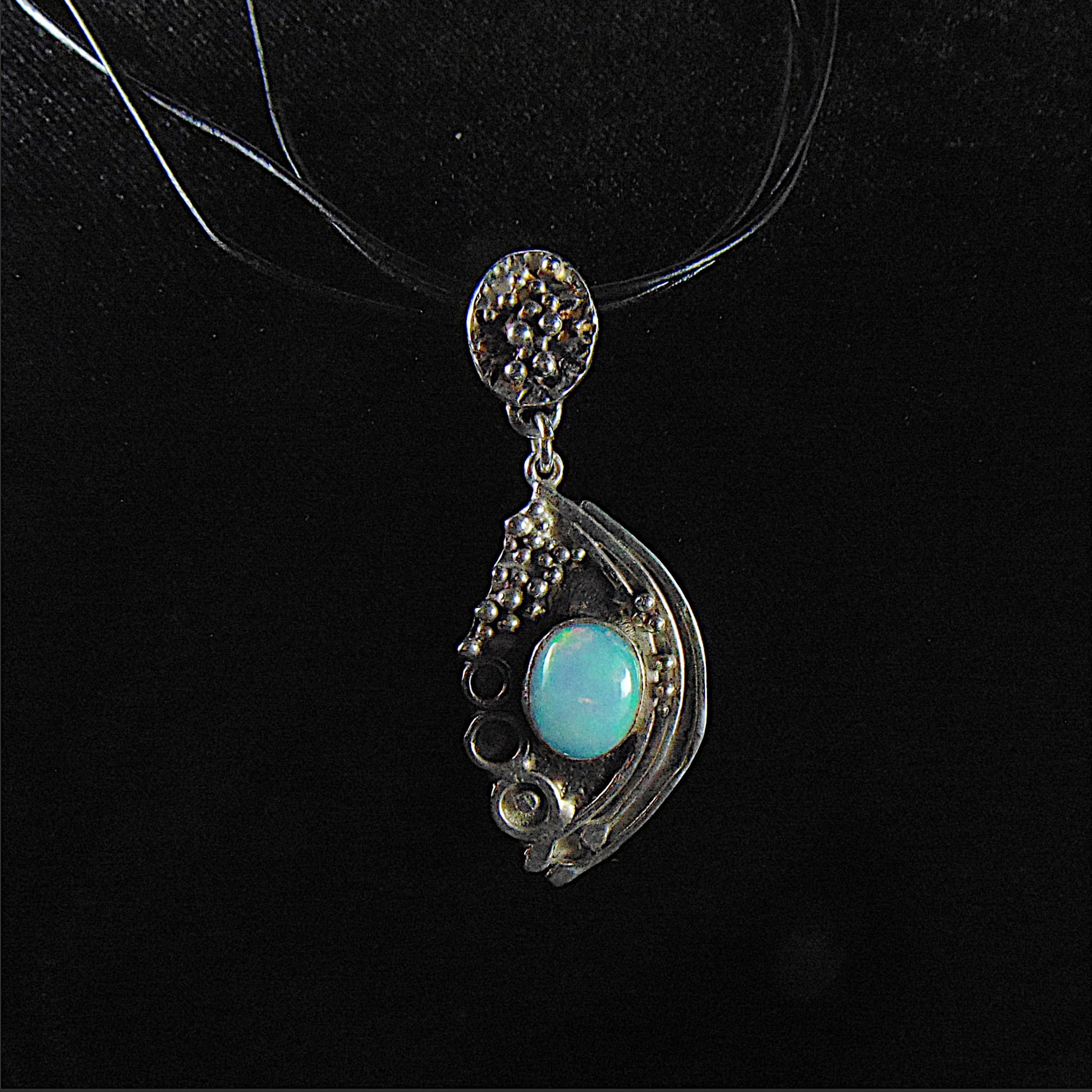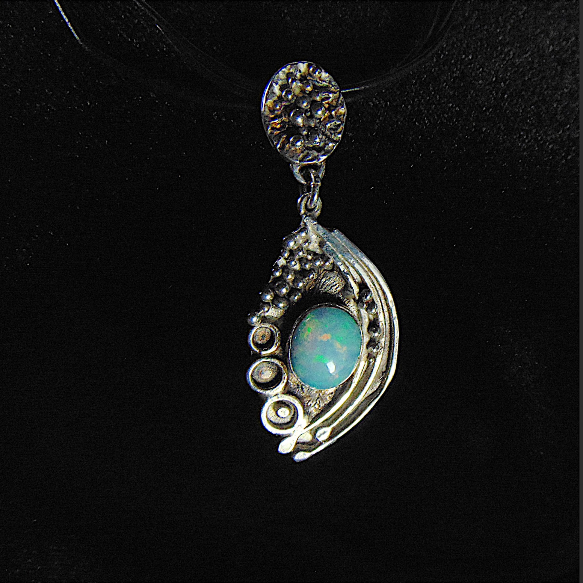 Inspiracja: Kamień centralny – opal – jest zamknięty w rzeźbiarskiej, srebrnej kompozycji, co symbolizuje osadzenie ulotnej magii światła w trwałej, metalowej formie. Górny, mniejszy moduł z szerokim uchwytem pełni rolę "korony", stabilizującej i eksponującej cenne serce wisiora.