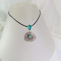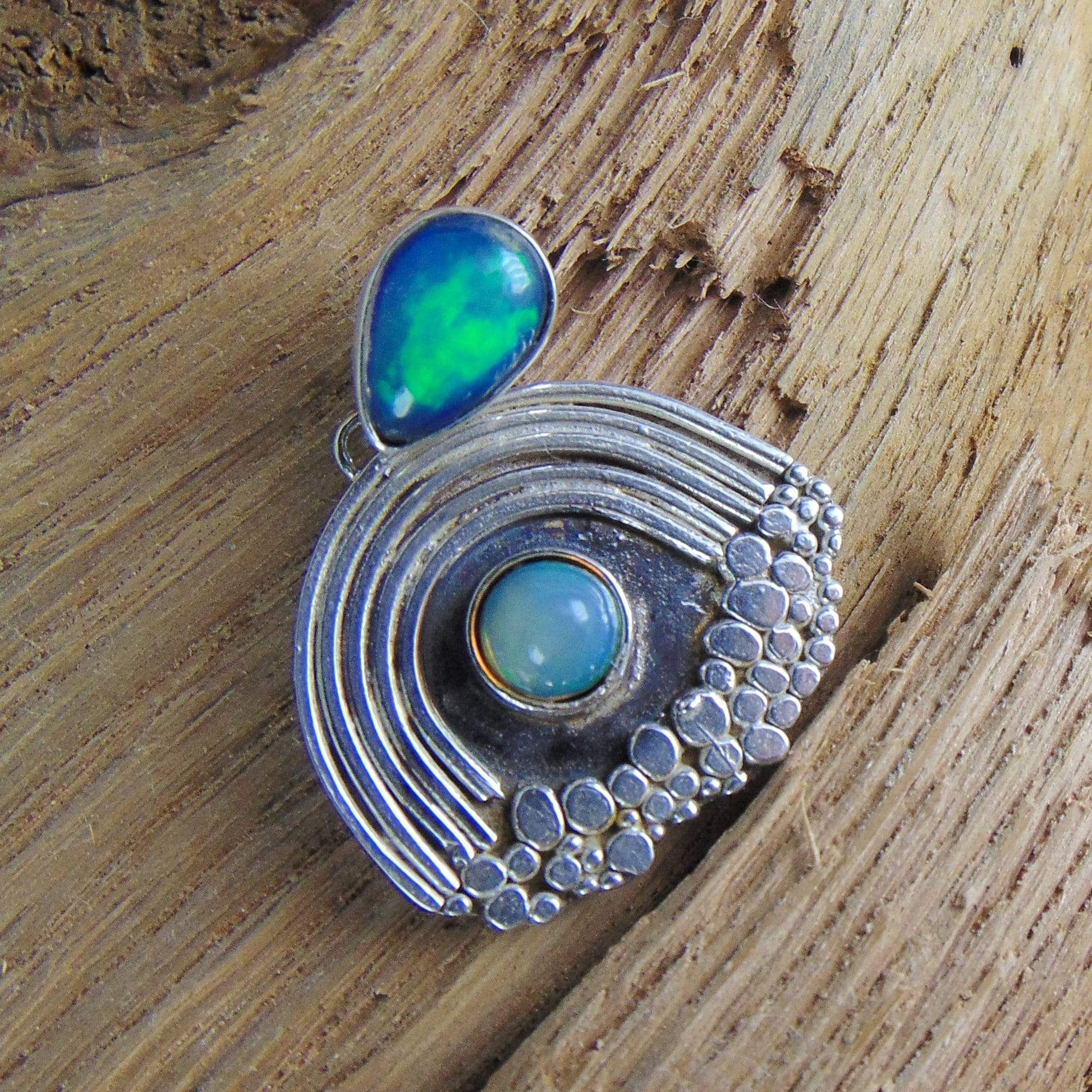 Wisior srebrny z dwoma opalami etiopskimi. Wykonany ze srebra pr. 925, składa się z dwóch łączonych elementów. W górnym elemencie umieściliśmy piekny niebiesko - zielony opal typu solid, o wadze 1,6 karata. Ma on bardzo żywą opalescencję w zielonym, ale i w czerownym odcieniu. W dolnym pólokrągłym elemencie umieszczony jest mały okrągły zielony opal. Bardzo ciekawe jest zestawienie dwóch różnych opali w jednym wyrobie.