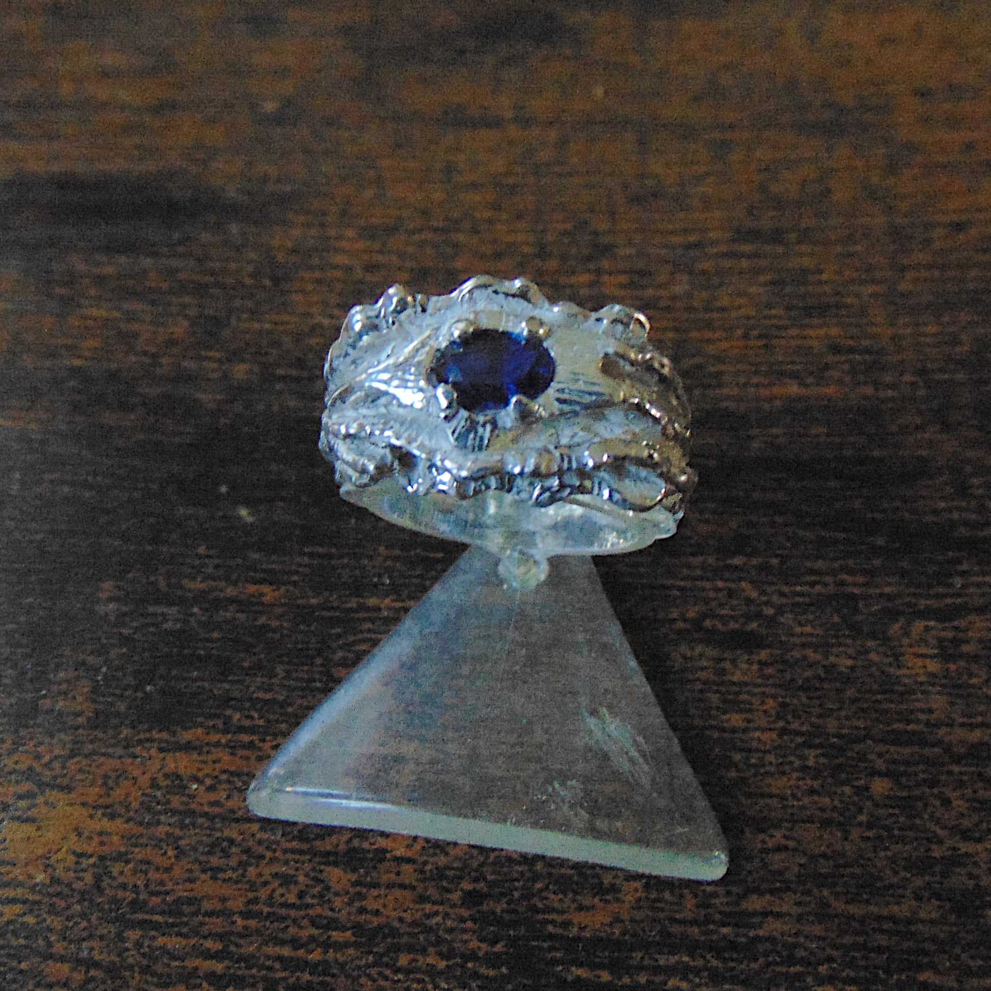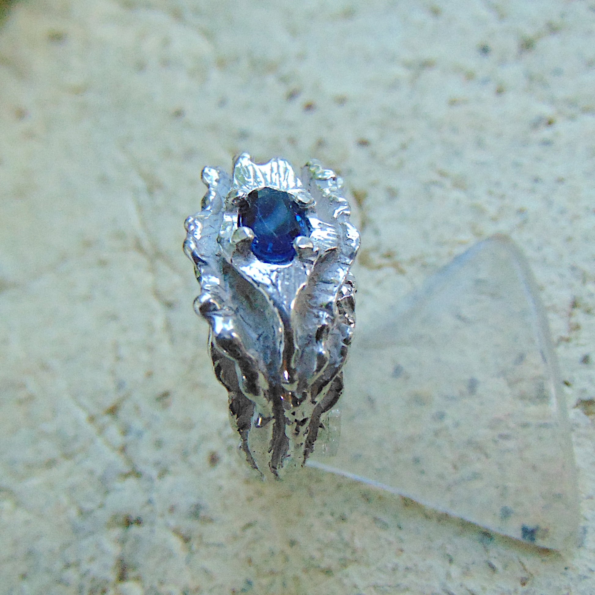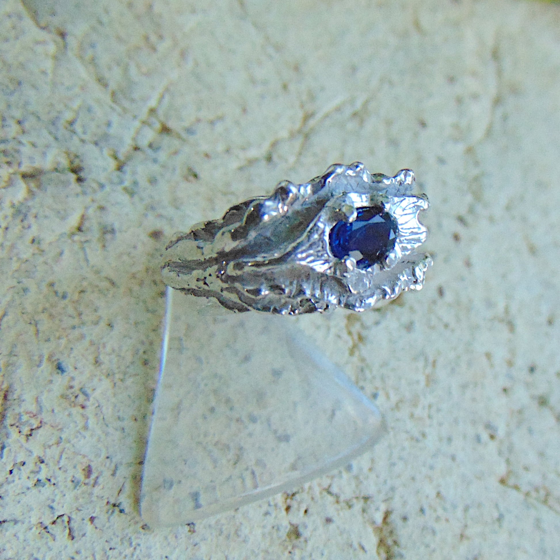 Centralnie osadzony jest naturalny szafir, kamień szlachetny z grupy korundów. Szafir charakteryzuje się głębokim, ciemnoniebieskim kolorem i wysoką czystością. Precyzyjny szlif kamienia maksymalizuje jego naturalny blask. Szafir należy do najtwardszych minerałów (9 w skali Mohsa), co zapewnia mu wyjątkową trwałość i czyni pierścionek idealnym do noszenia na co dzień.