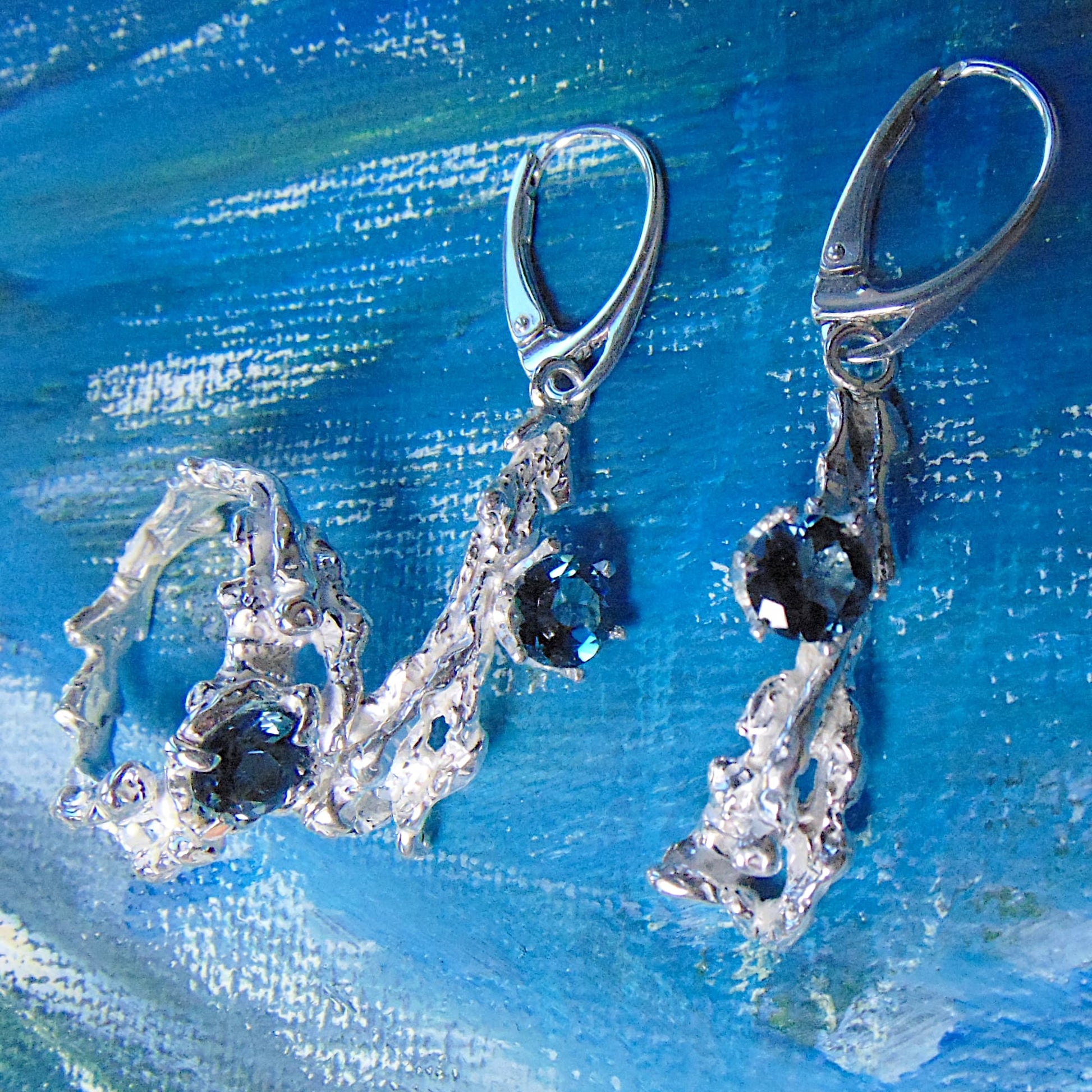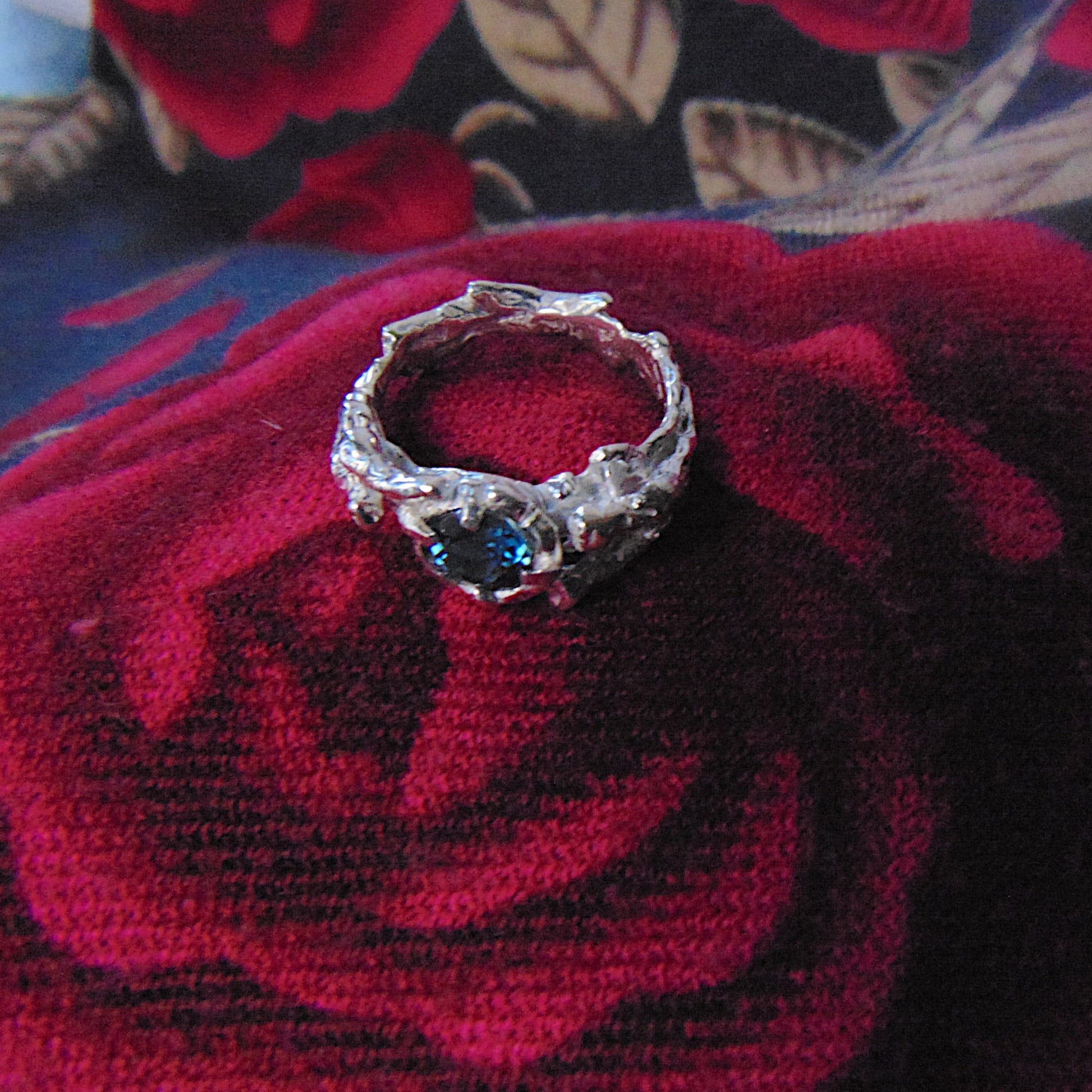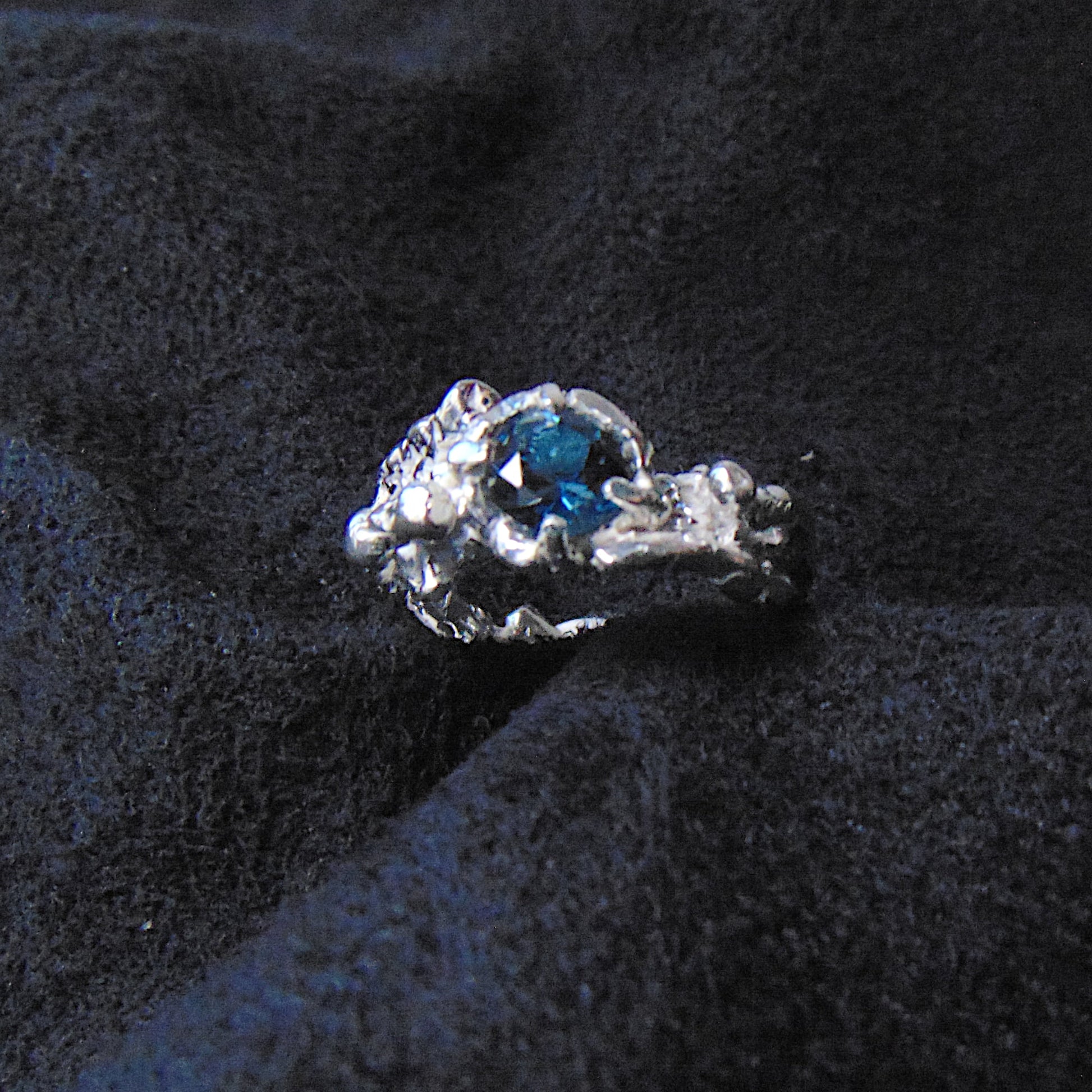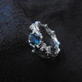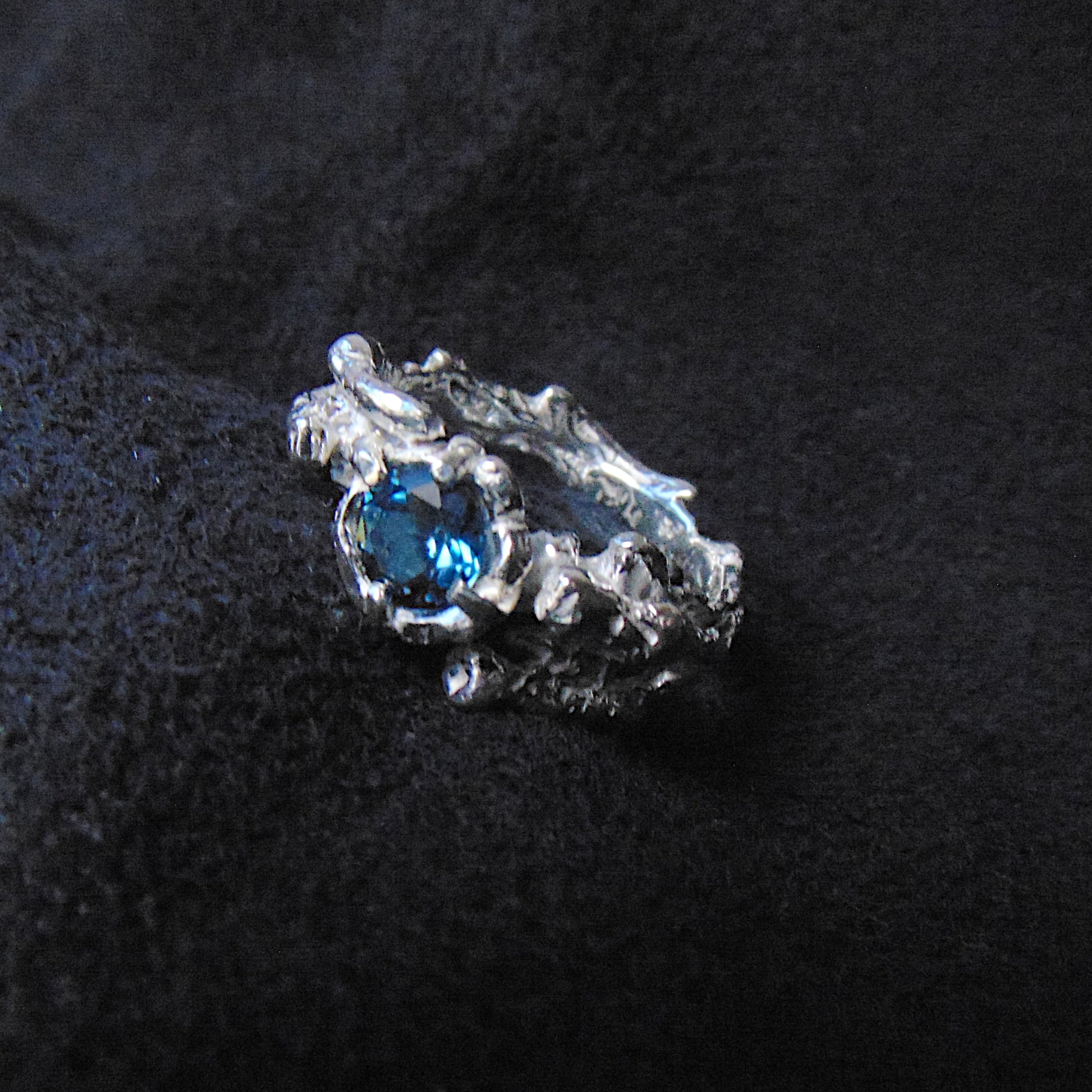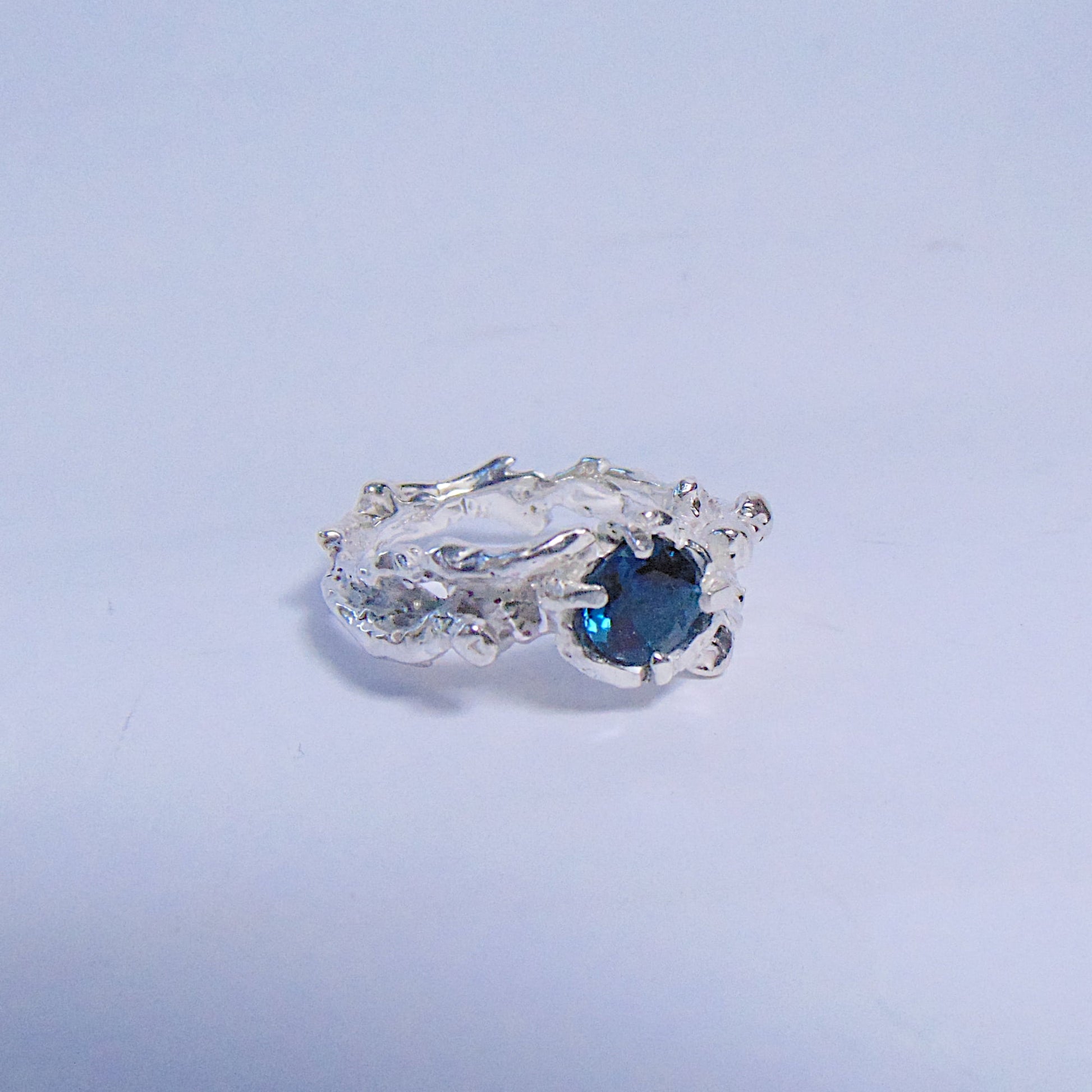 Kompozycja o rzeźbiarskim charakterze stanowi hołd dla surowego piękna przyrody, zamykając na dłoni fragment leśnego krajobrazu. Srebrne pędy o nieregularnej, organicznej strukturze naturalnie oplatają palec, tworząc solidną, a zarazem dynamiczną formę, w której centrum spoczywa Topaz London Blue. Głęboka ciemnoniebieska barwa kamienia, przywodząca na myśl kolor burzowego nieba, stanowi idealny kontrapunkt dla jasnego srebra, nadając całości wyrazisty kształt