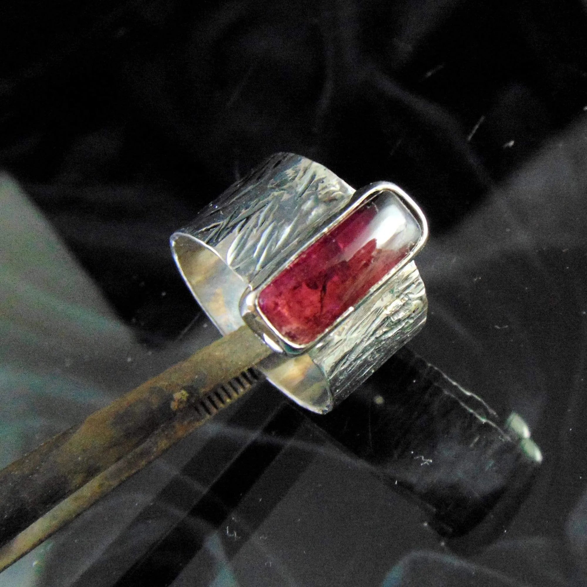 Szeroka obrączka srebrna, ryflowana z turmalinem. Wykonana ze srebra pr. 925. Turmalin jest przejrzysty, ciemnoróżowy.