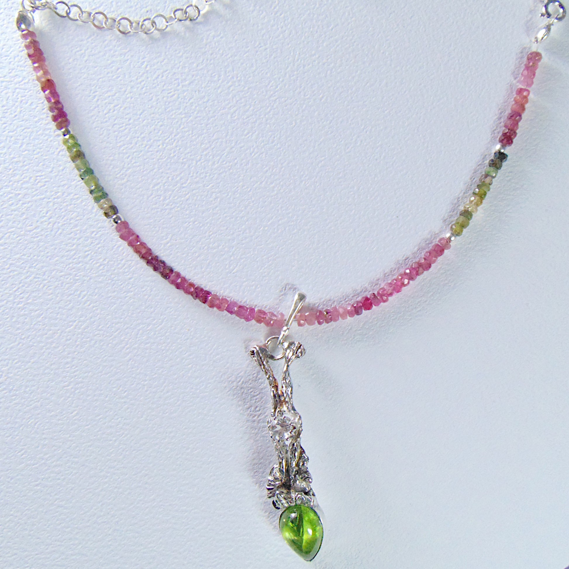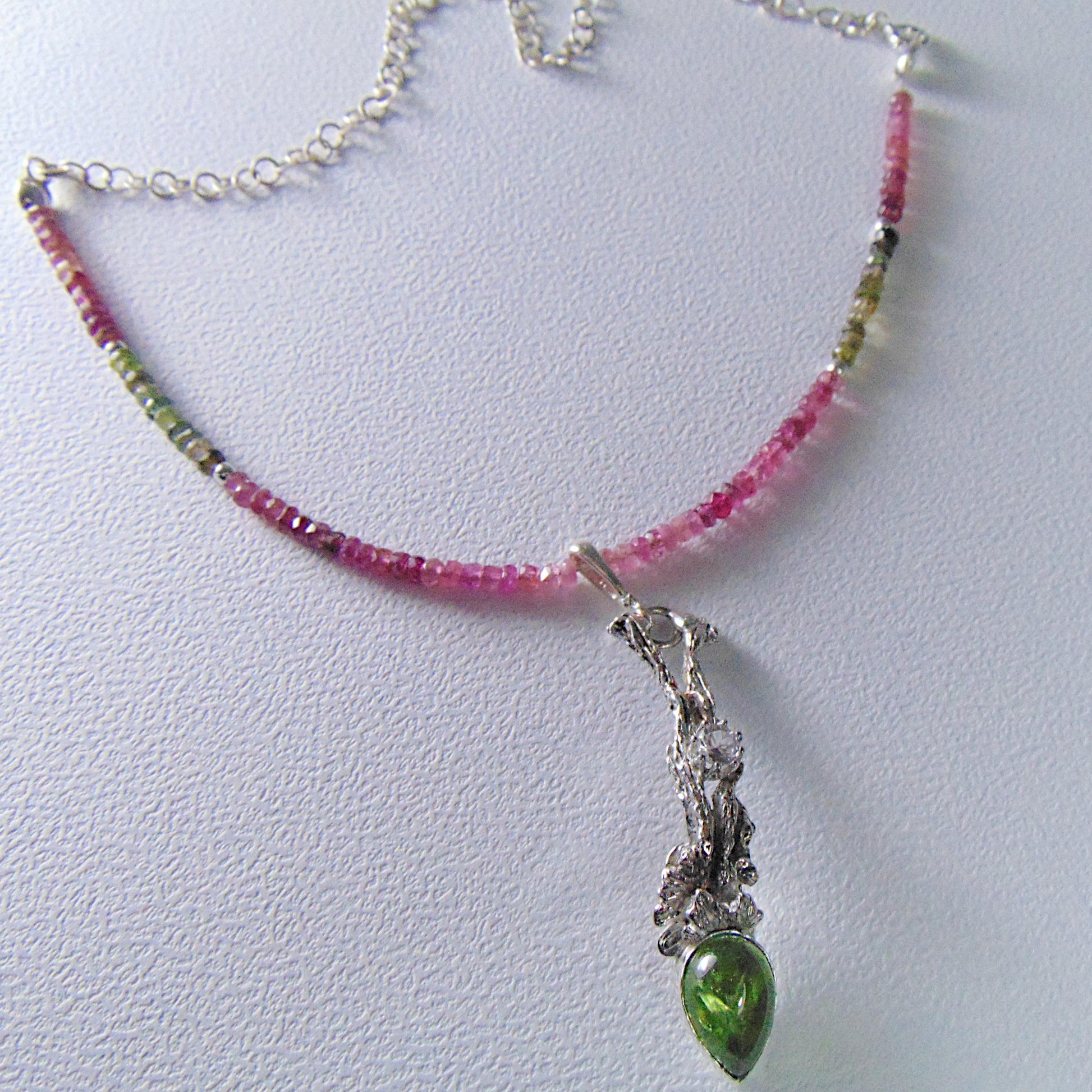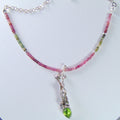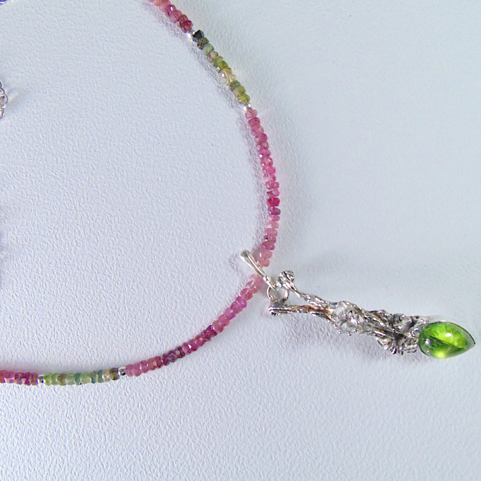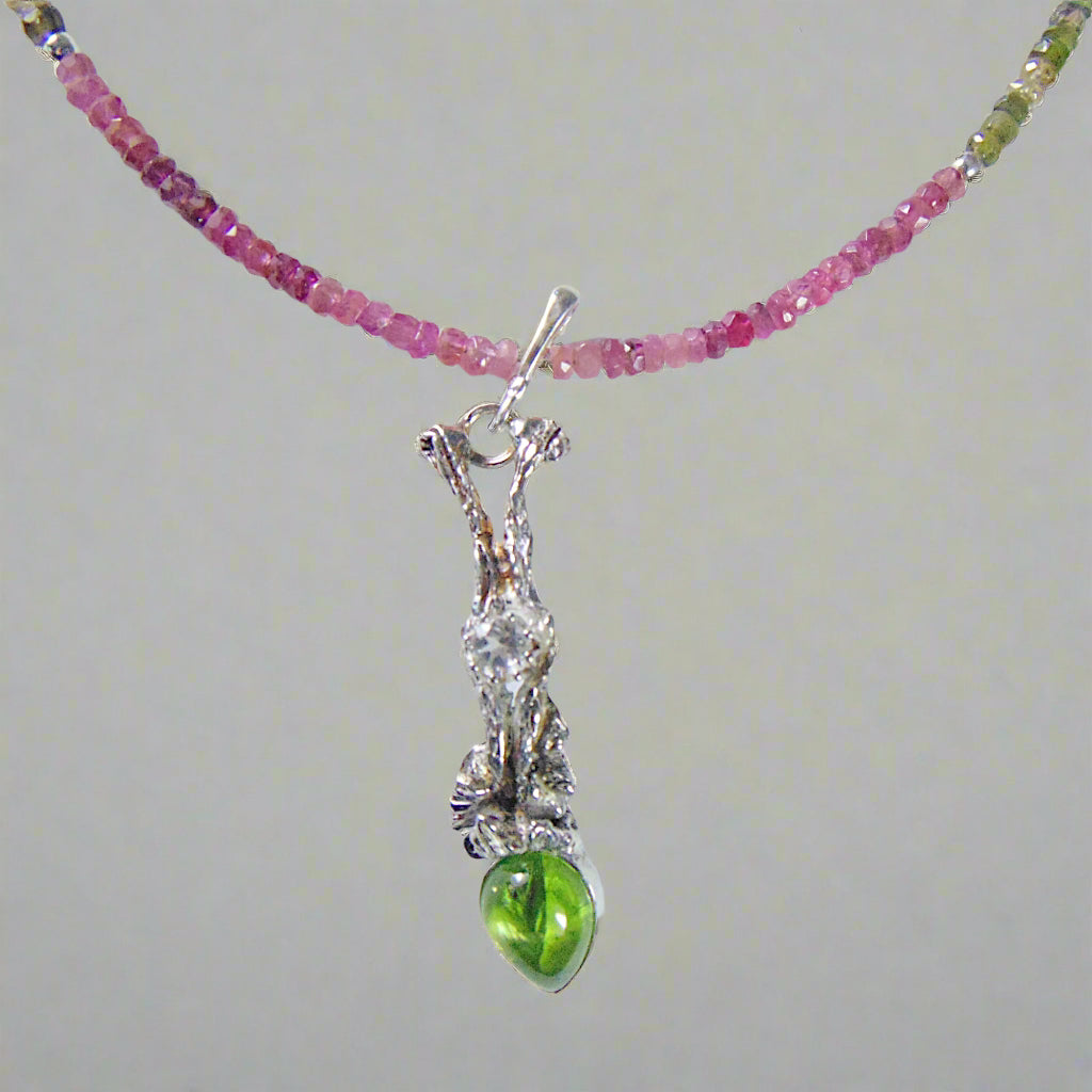 Wisior jest integralną częścią naszyjnika skomponowanego z barwnych, fasetowanych turmalinów. Tworzą one harmonijną całość z zielenią oliwinu, dodając całości lekkości. To gotowa do noszenia ozdoba, idealna dla kobiety ceniącej oryginalny design inspirowany naturą oraz szlachetne, naturalne materiały.
